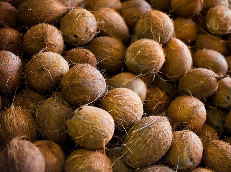 A semi-husked coconut has its outer, fibrous husk partially removed, revealing the hard inner shell but leaving some of the husk intact, often around the "eyes" or top of the coconut. This processing makes the coconut easier to open while still providing some protection for the sensitive eye area, extending its shelf life. The meat and water are accessible for culinary use, such as in beverages, sweets, and savory dishes.